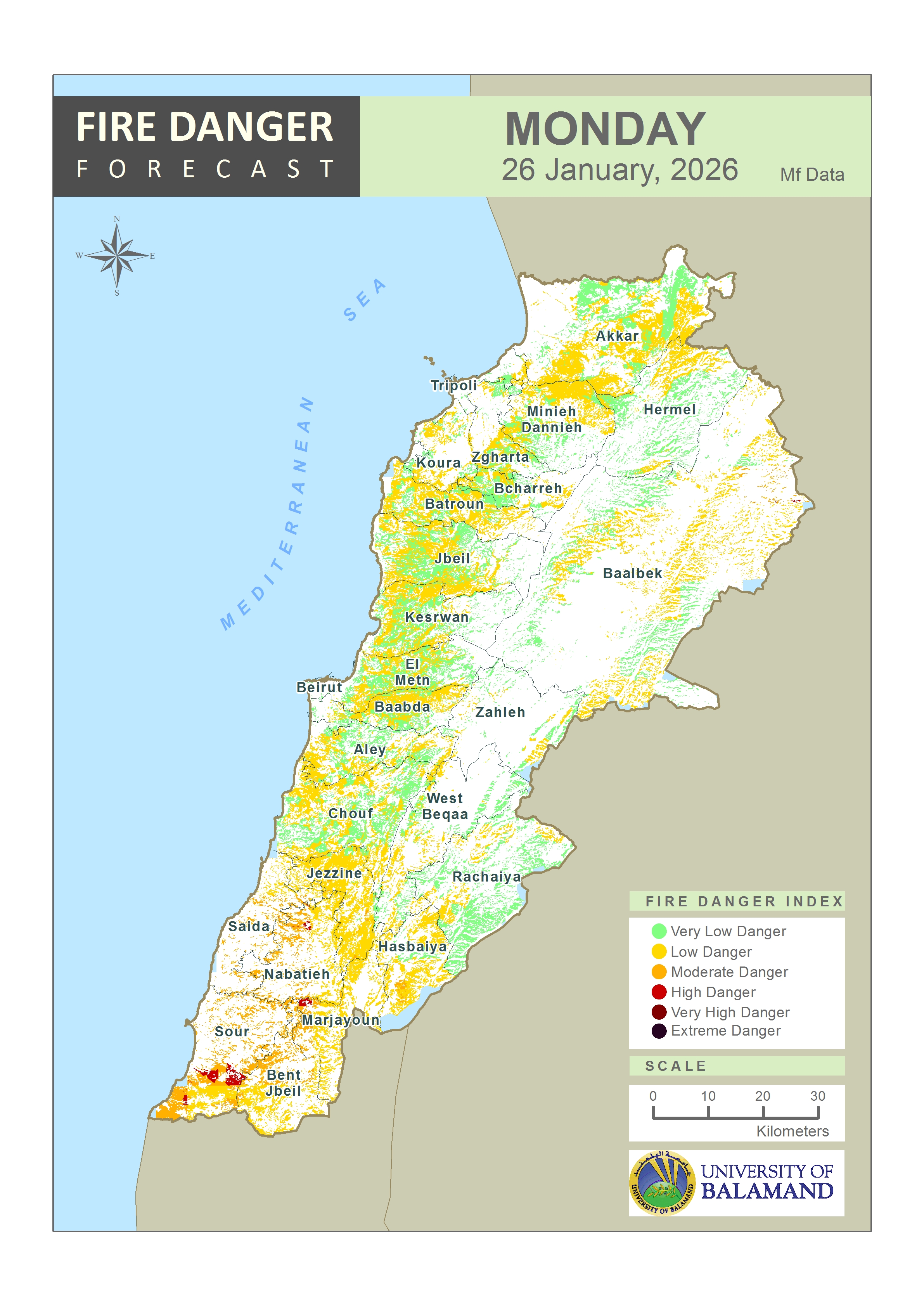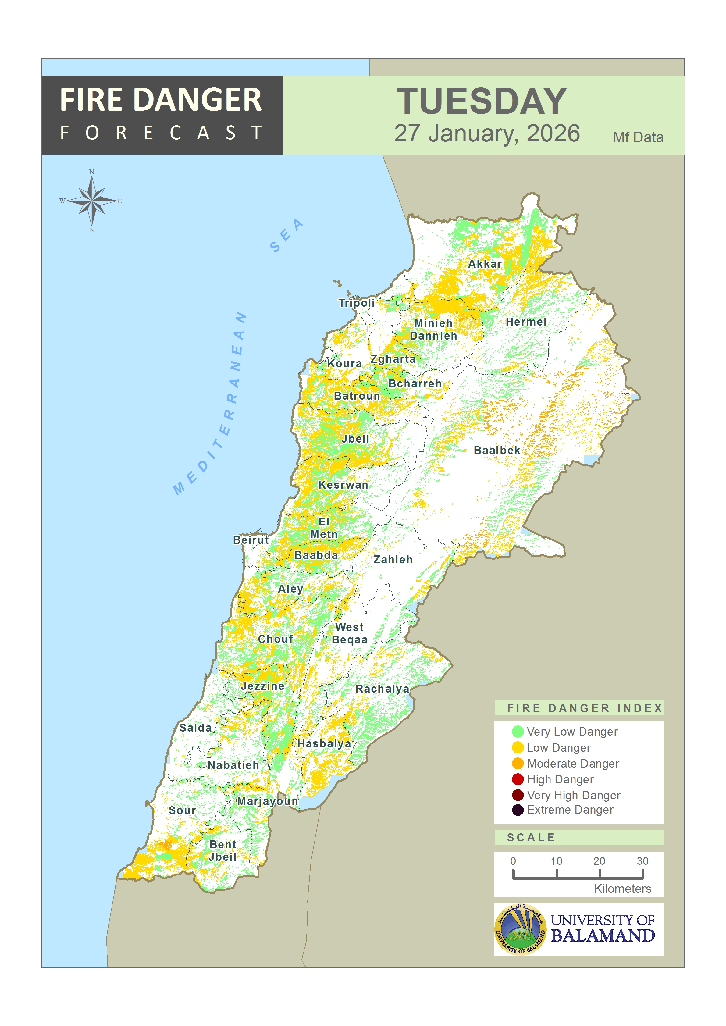 وذكر التقرير اليومي على المنصة الإلكترونية ليوم الأربعاء أن المناطق الريفية الشمالية الشرقية لمحافظة عكار، والمغطاة بغابات الصنوبر الكثيفة، معرضة "لخطر شديد" من حرائق الغابات، كما وأن مؤشرات محافظة الشمال وجبل لبنان والبقاع بشكل عام مرتفعة ومرتفعة جدا ومرتفعة جدا جدا، ومن الجدير ذكره أن وزارة البيئة تنسق مع البلديات والمجموعات المحلية لتشجيع إزالة الأعشاب ومكافحة الحرائق، ومن ضمنها توفير أموال الطوارئ لكل حالة على حدة لفرق مكافحة الحرائق.